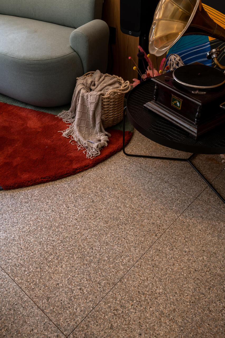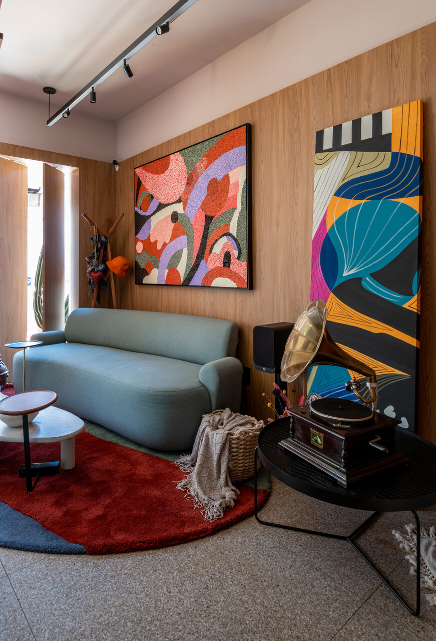 Para harmonizar com os objetos de cores vivas do ambiente, o principal revestimento utilizado foi o da linha Ibirapuera da Villagres, criado em homenagem a Oscar Niemeyer, remetendo ao modernismo e à beleza da simplicidade. E para dar a sensação de profundidade, o produto foi utilizado no piso e na parede, proporcionando leveza ao recinto através de sua textura, cor e tamanho.