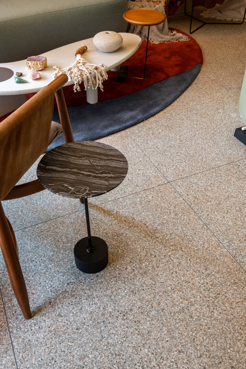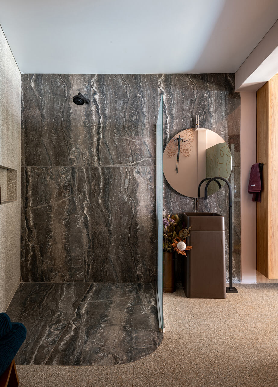 Em contraposição à proposta clássica, os profissionais escolheram o Travertino Titanium – uma variedade de travertino extraída no Irã e na Turquia – com tonalidade que varia do cinza profundo ao claro e leves toques de marrom, ideal para compor ambientes com design moderno, combinando perfeitamente com materiais industriais, como aço e concreto.