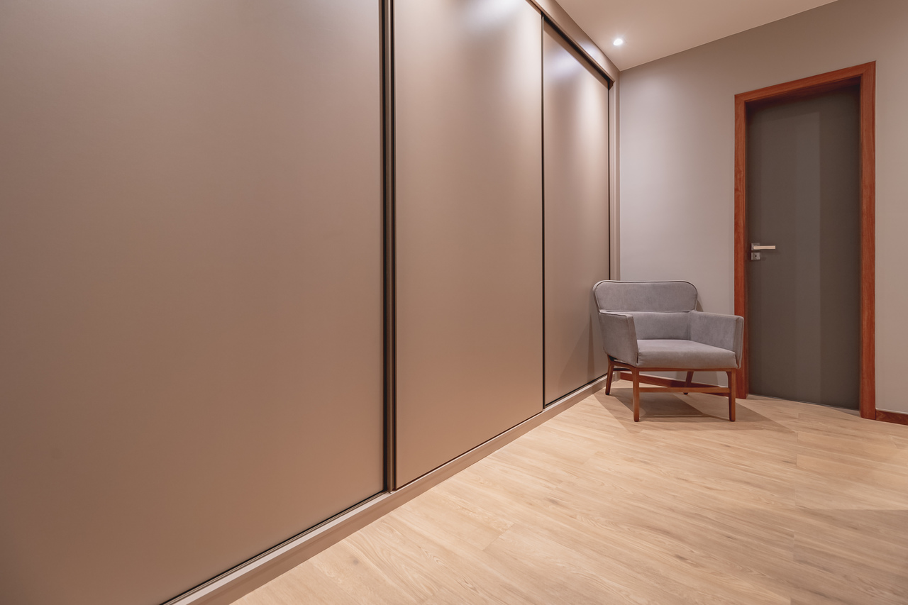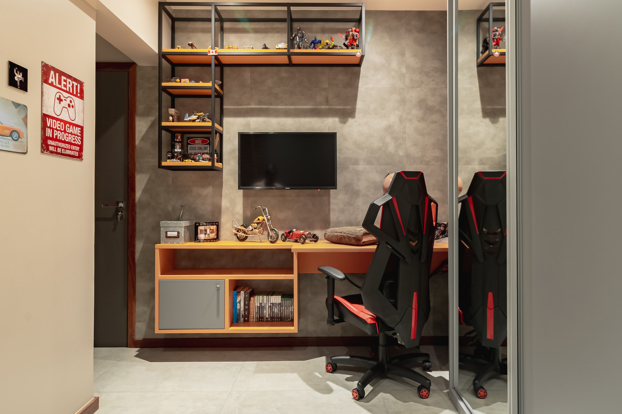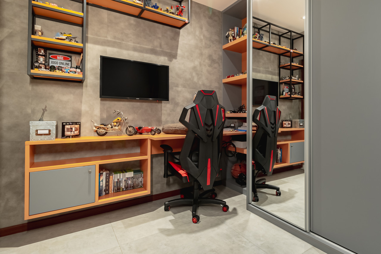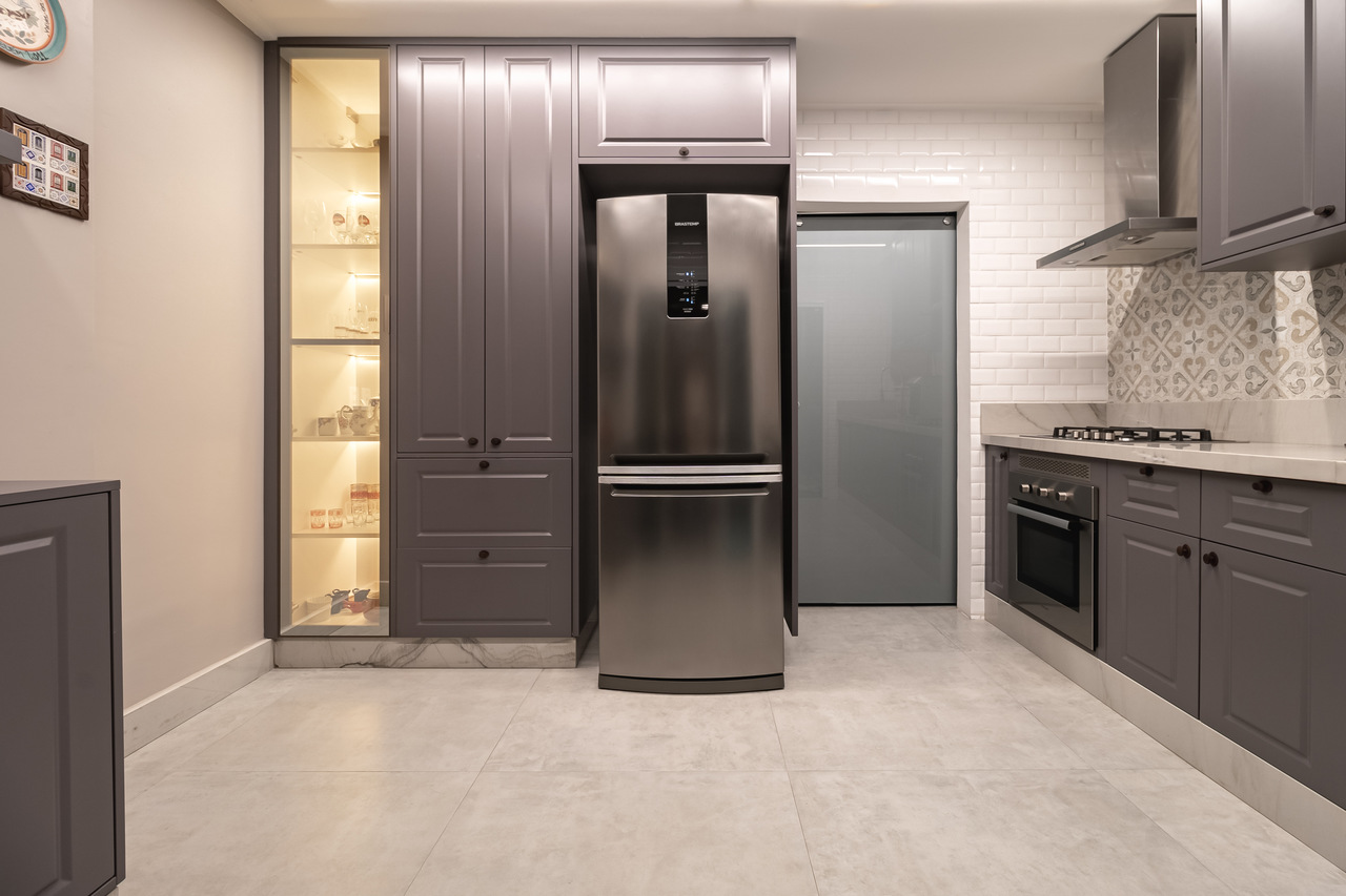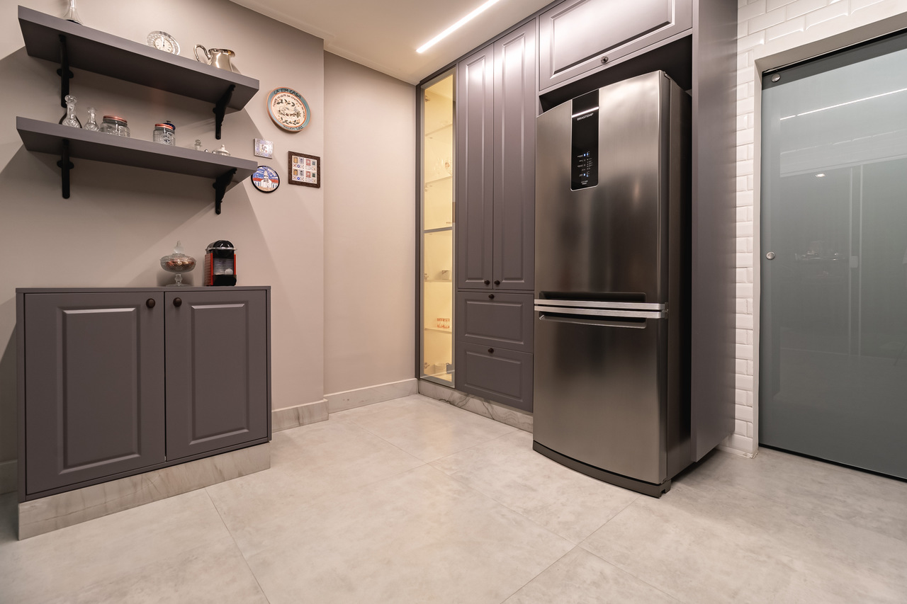 Todo o mobiliário funcional, cozinha e closet foram feitos com móveis planejados Celmar Móveis.