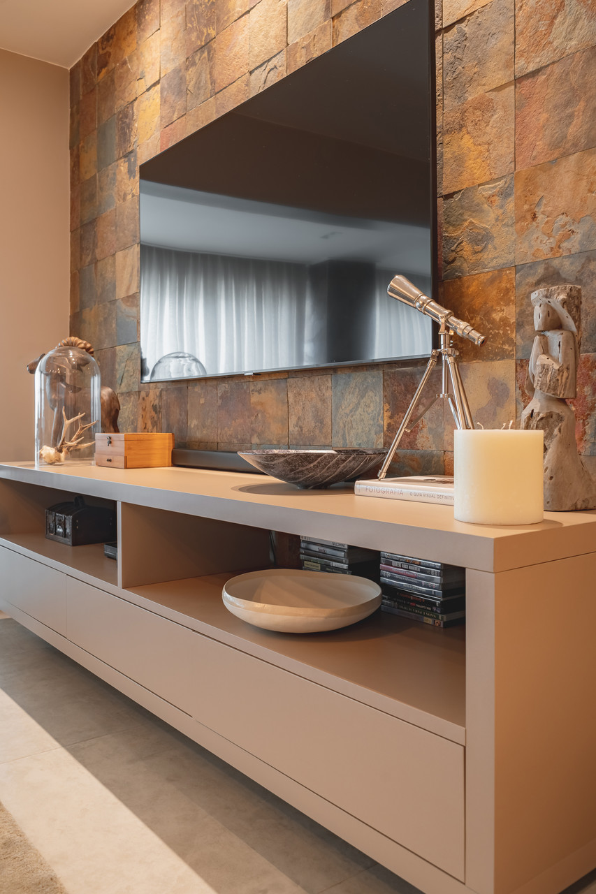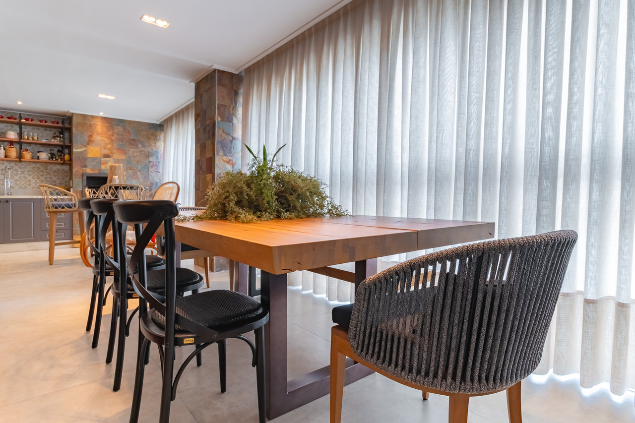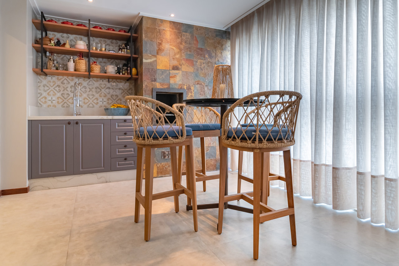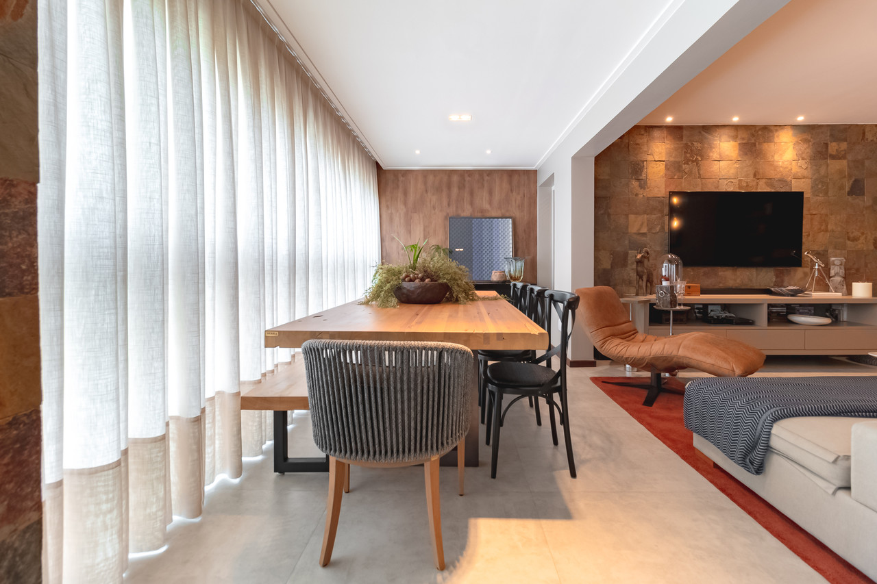 Para atender às necessidades da família, os mais de 160 m² foram adequados. A sala foi ampliada com varanda e espaço gourmet para lazer dos moradores. O piso de porcelanato na cor cimento queimado harmoniza com a textura de pedra oxi natural. Tudo isso dá um ar de longevidade e história no projeto.