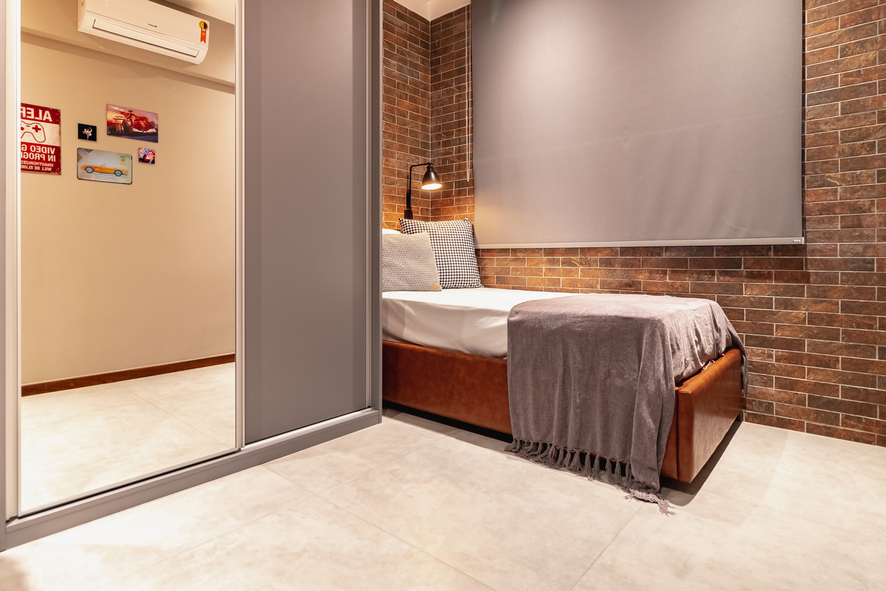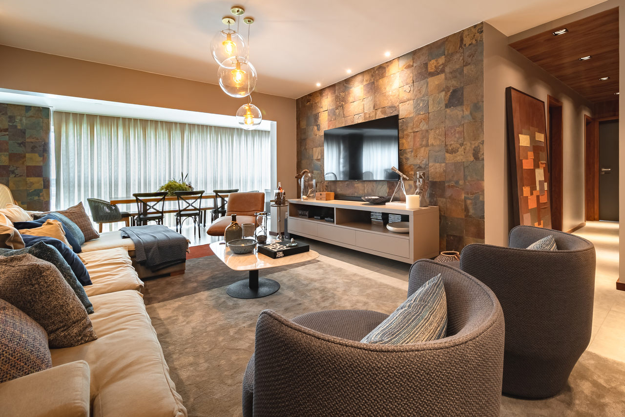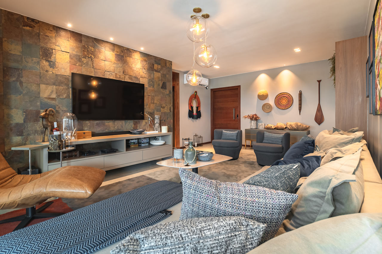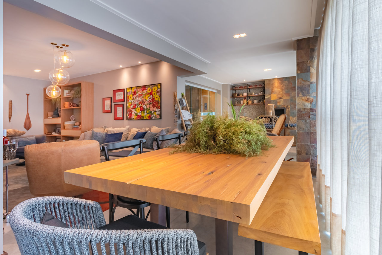 Para atender às necessidades da família, os mais de 160 m² foram adequados. A sala foi ampliada com varanda e espaço gourmet para lazer dos moradores. O piso de porcelanato na cor cimento queimado harmoniza com a textura de pedra oxi natural. Tudo isso dá um ar de longevidade e história no projeto.