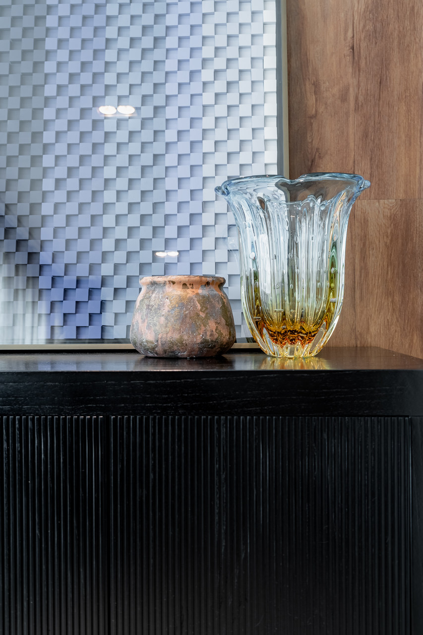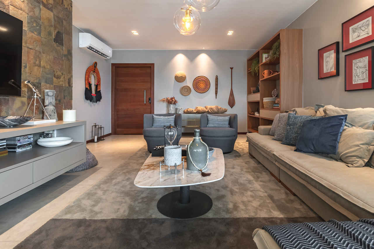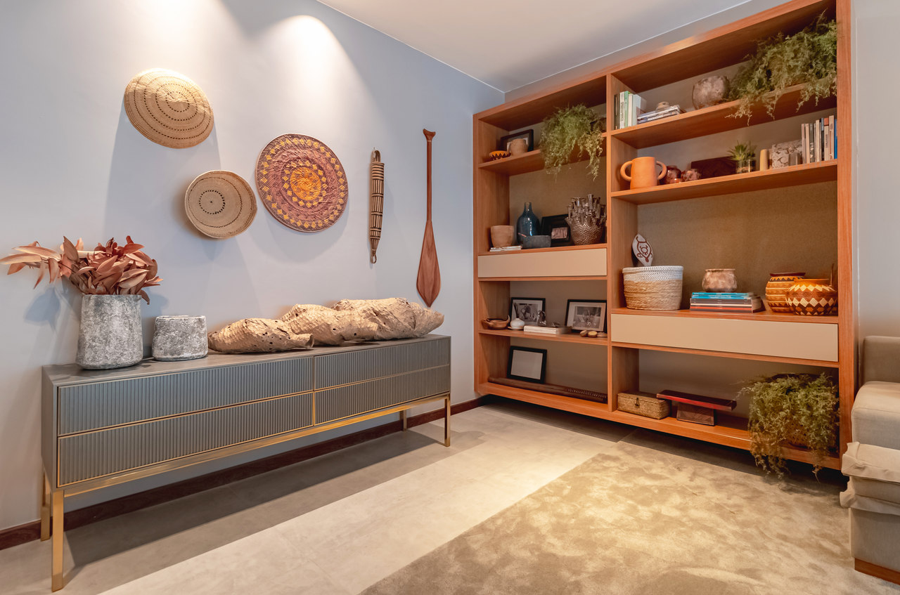 Os tons mais neutros das paredes e mobiliário foram pensados para receber cores e texturas de objetos e artesanatos que são do acervo e afetividade da família.